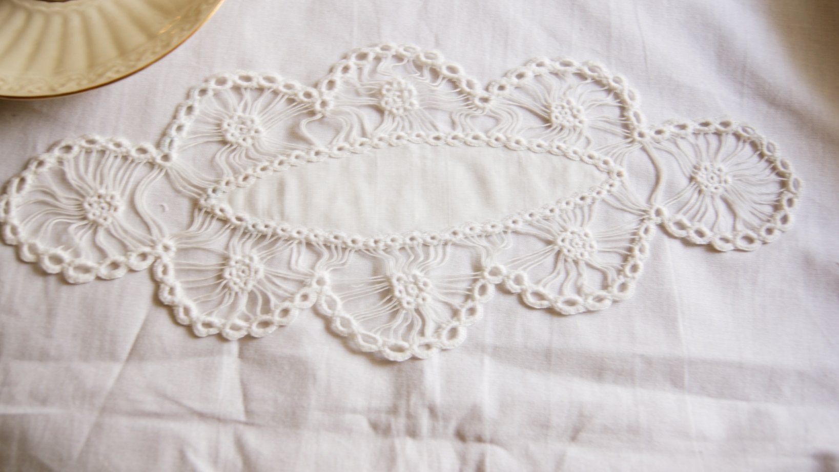 Piękny bieżnik wykonany Snutką Golińską. Ręcznie robiona biała serwetka.