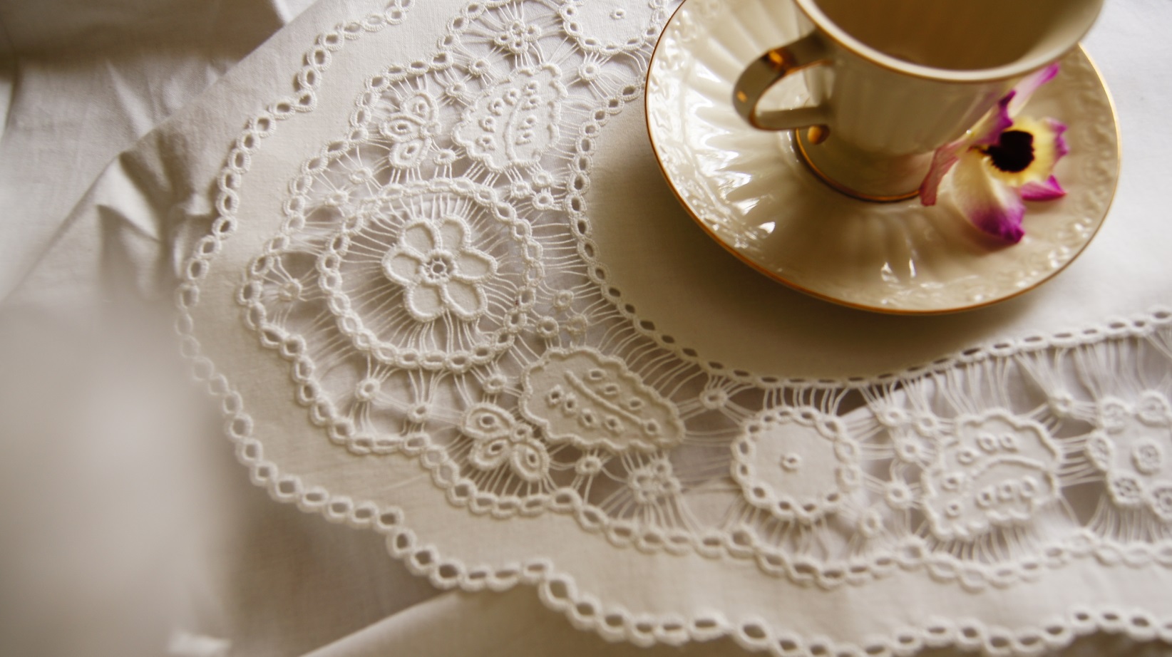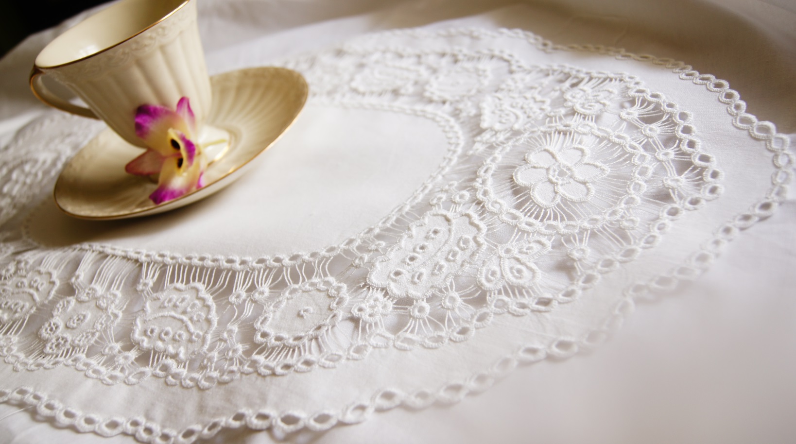 Piękny biały bieżnik z elementem wyszywanych kwiatów idealnie sprawdzi się w każdym wnętrzu.