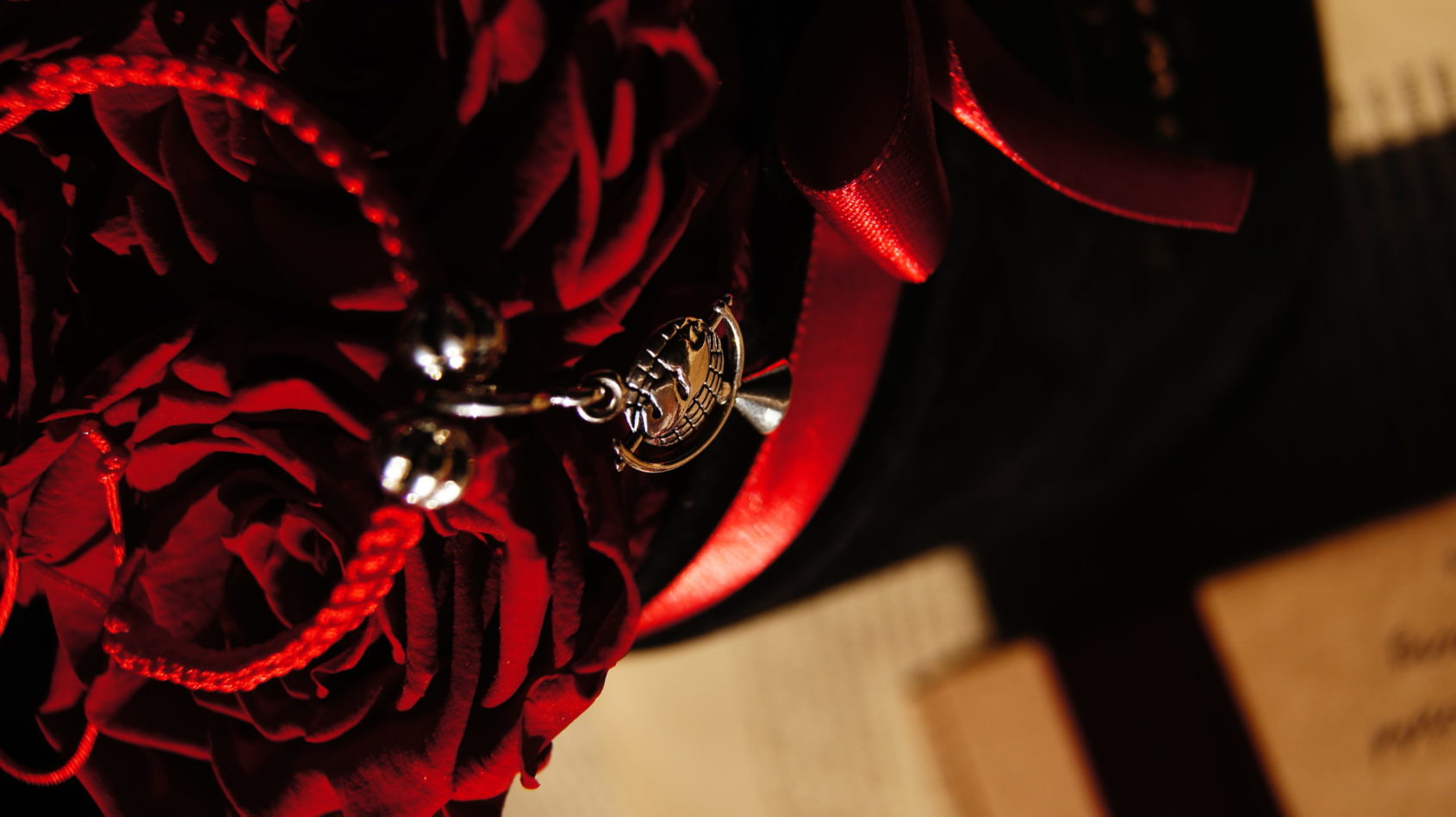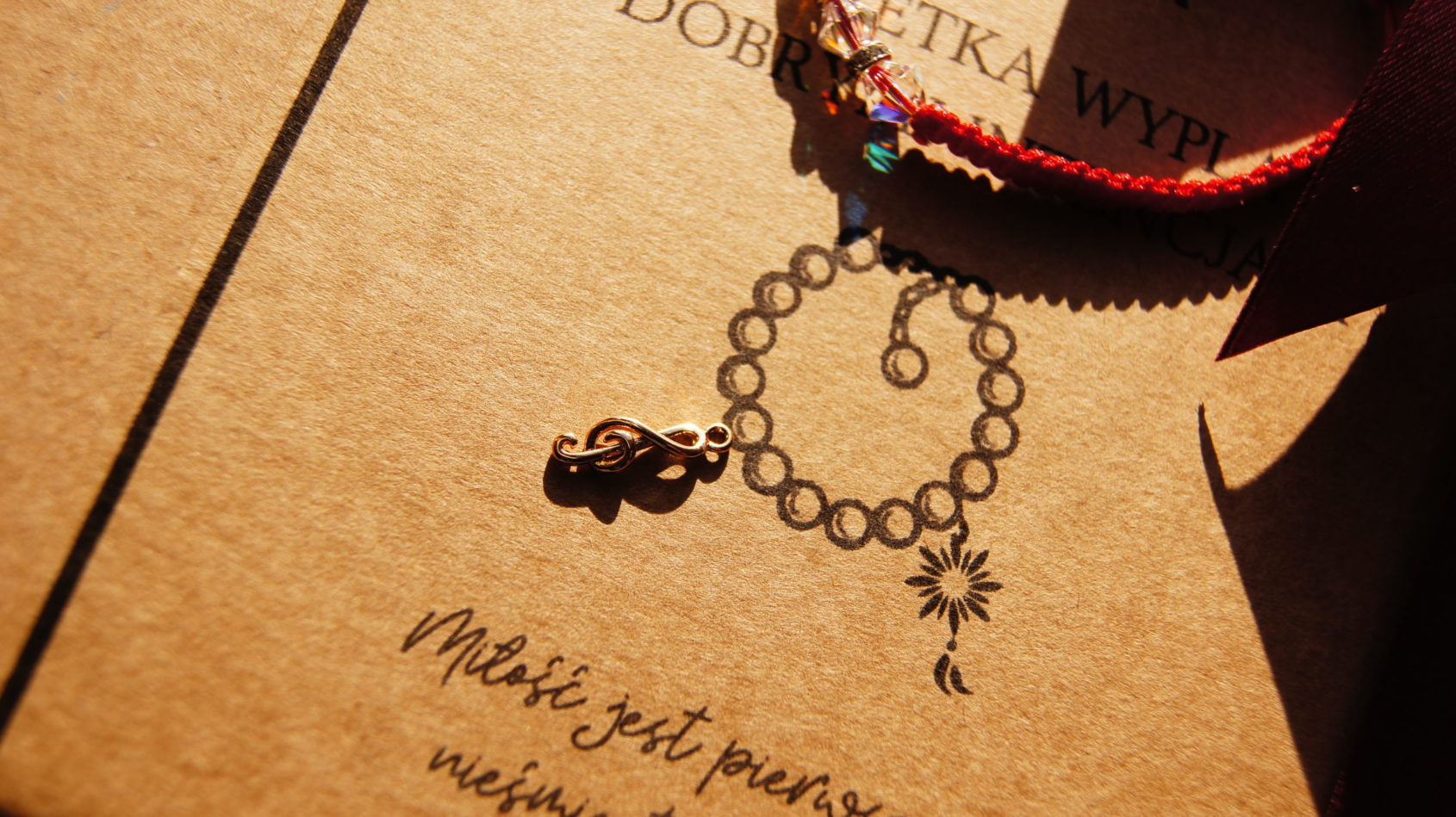Czerwona bransoletka z kryształkami Swarovskiego i kluczem wiolinowym.