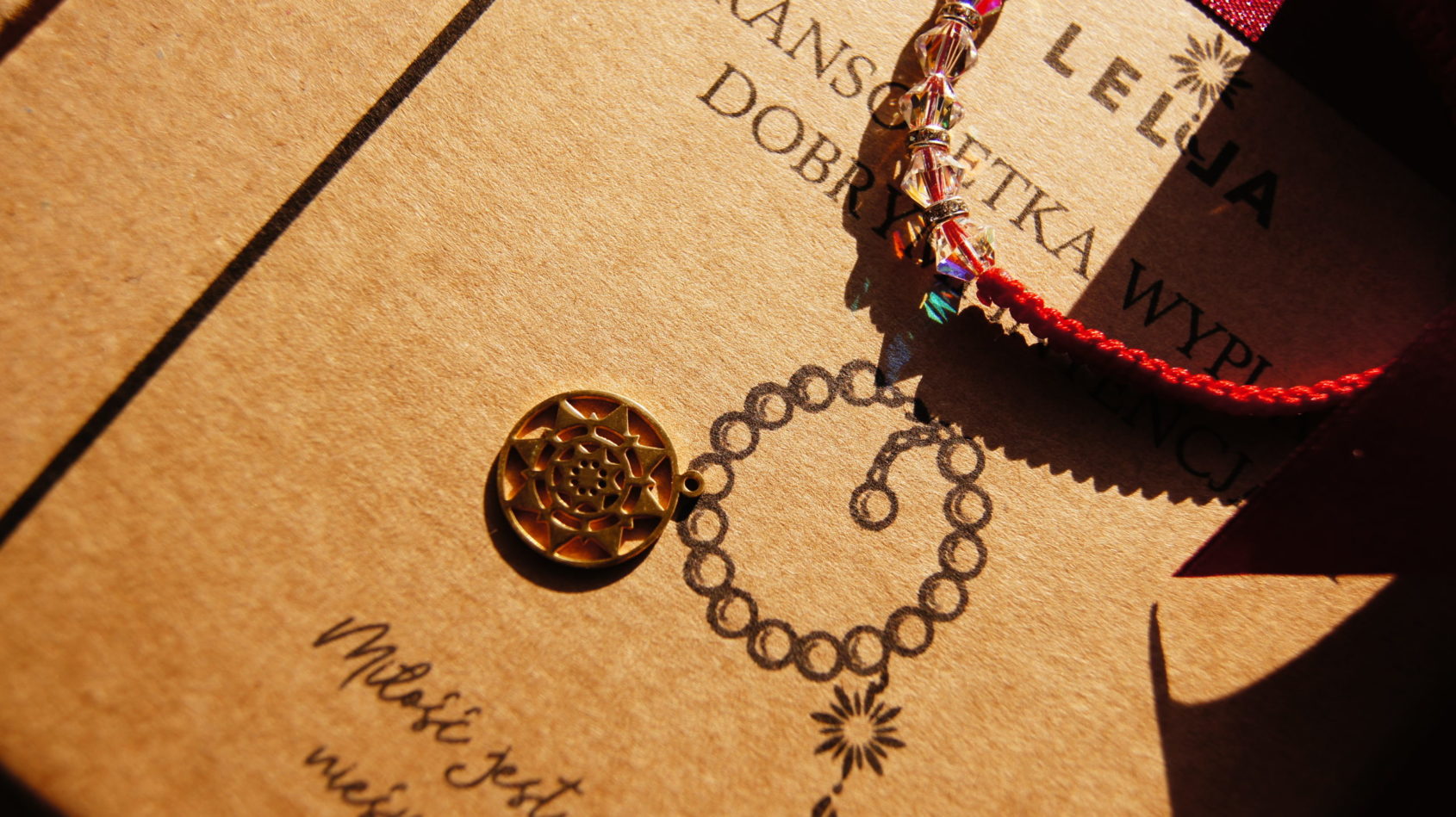 Czerwona bransoletka z kryształkami Swarovskiego i złotym Slońcem.