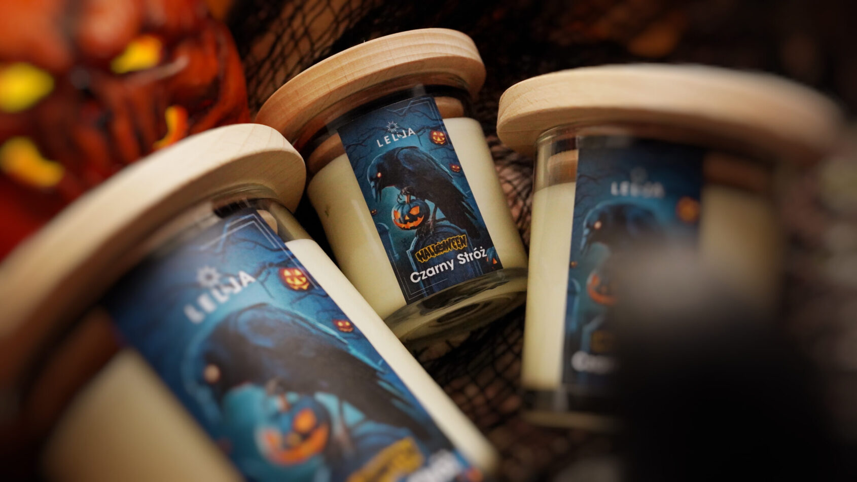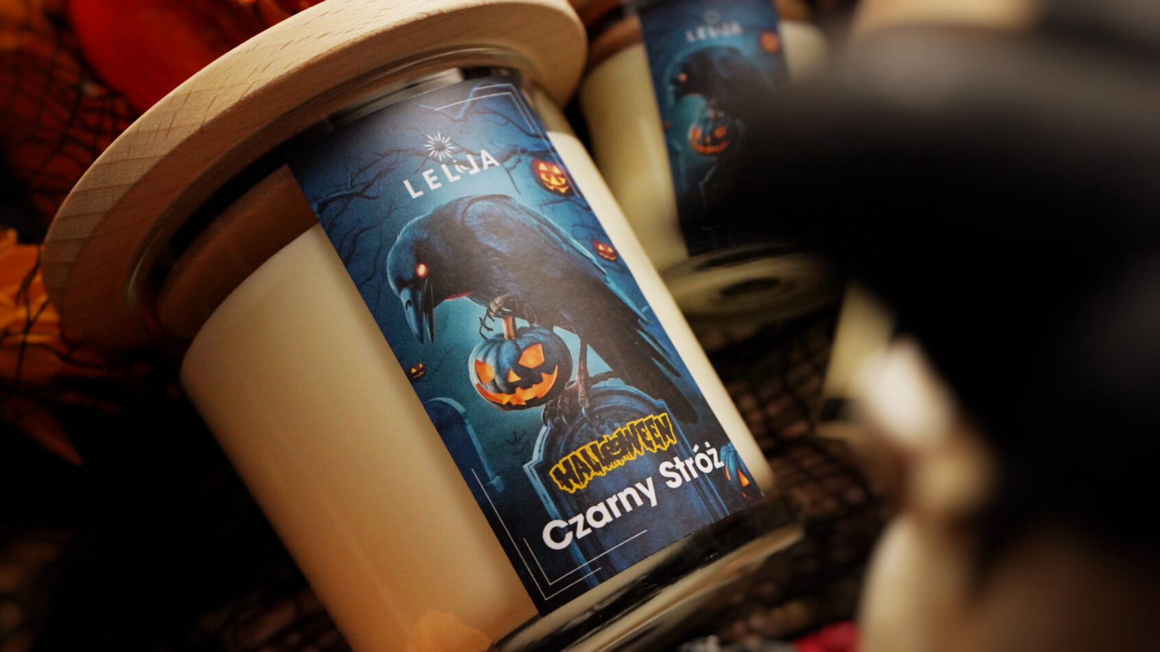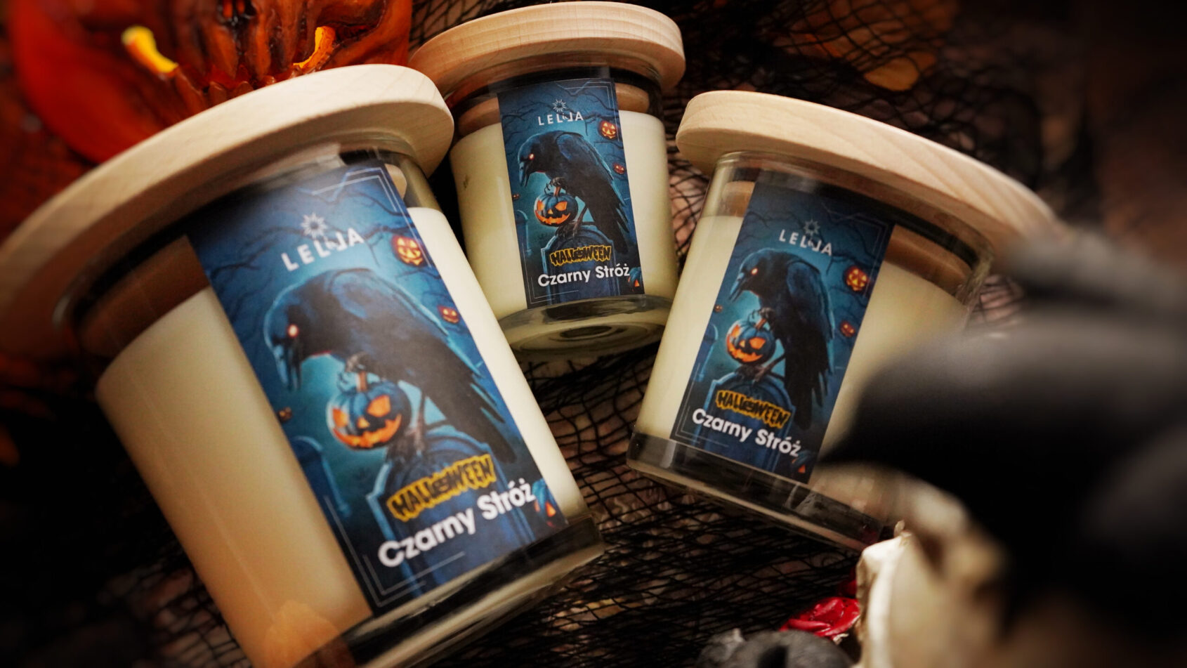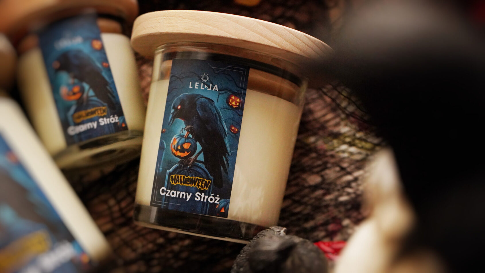 Aby tajemnicze chwile trwały jak najdłużej, zalałam świecę czystym, ekologicznym woskiem sojowym, który zapewnia długie i czyste palenie. Przezroczyste szkło pozwala widzieć rozpływający się w nocy płomień, tworząc iluzję kruka unoszącego się w nocnym niebie. Drewniana pokrywka wykonana w polskiej stolarni chroni świecę przed utlenianiem i kurzem, a także stanowi elegancką, stylową podstawkę. Etykieta przedstawiająca posępnego kruka, czuwającego nad dyniową lampą podkreśla atmosferę Halloween – mroczną, a zarazem pełną uroku.