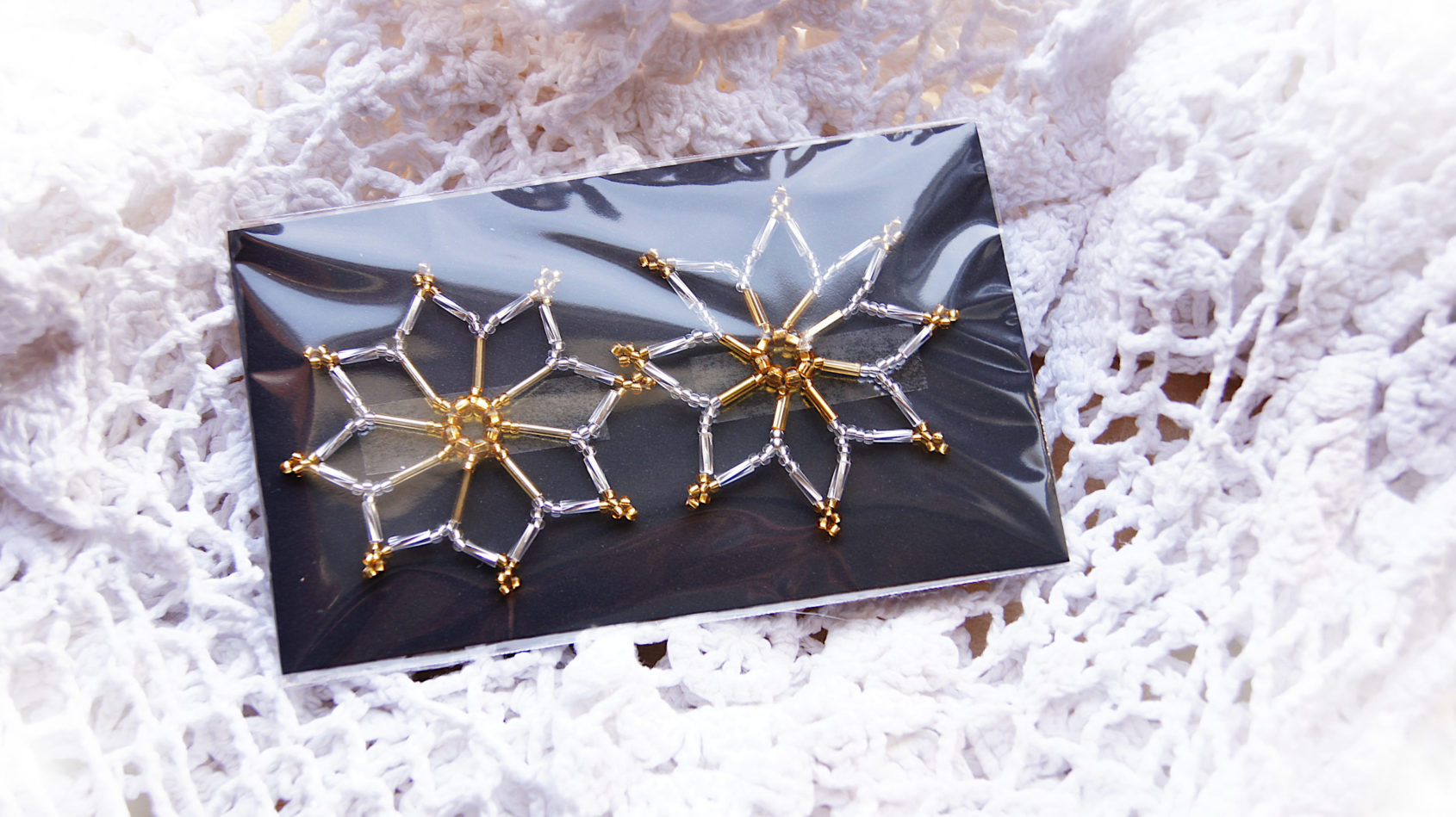 Gwiazdki z koralików srebrne ze złotymi elementami.