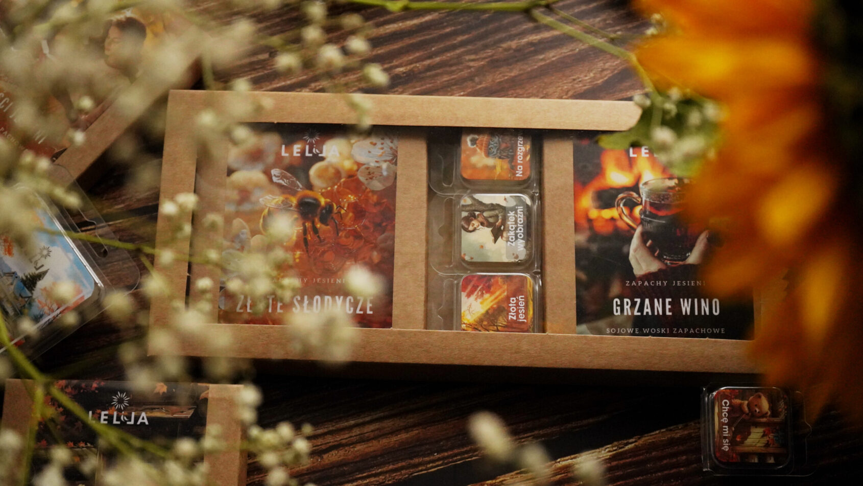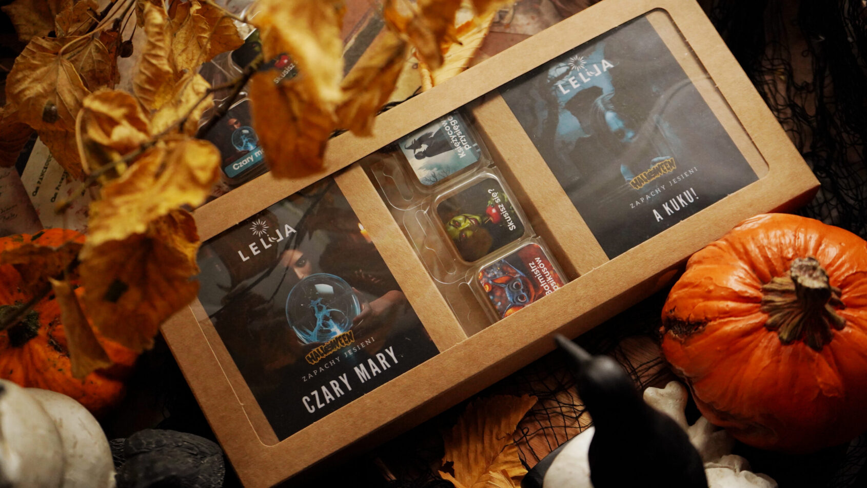 Ten zestaw wyróżnia się możliwością swobodnego wyboru zapachów z najnowszej kolekcji jesiennych i Halloweenowych wosków. Ty decydujesz, jaki aromat dziś wypełni Twój dom. Może wybierzesz dziś aromatyczne, pieczone jabłko z Jabłkowego szału albo skusisz się na drzewne, bardziej intrygujące nuty bursztynu i piżma z mrocznej kompozycji BOO? Woski wykonałam z ekologicznego, naturalnego wosku sojowego, dzięki czemu wosk rozpuszczając się, powoli uwalnia wszystkie nuty, wypełniając pomieszczenie atmosferą ciepła i magii.