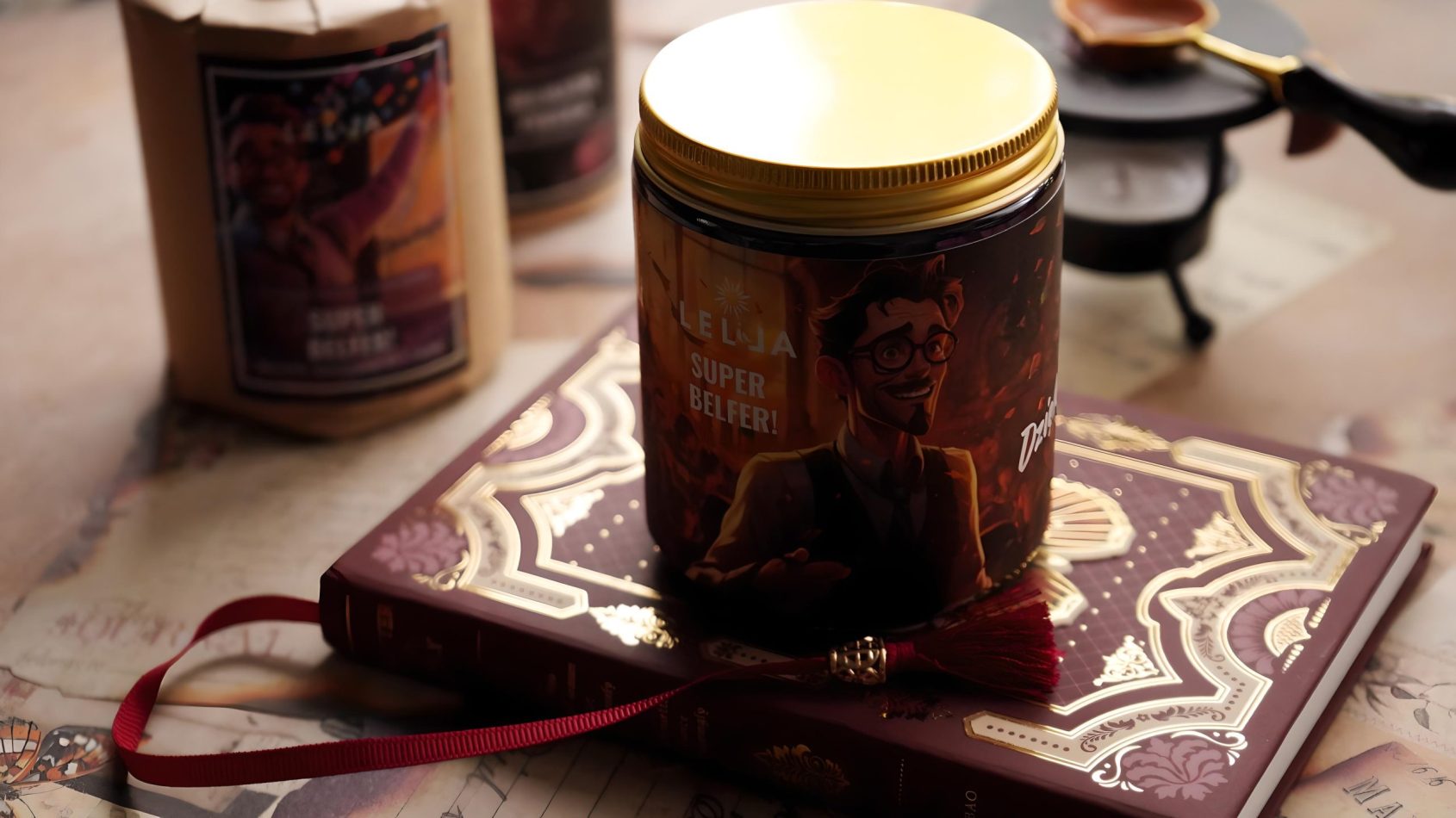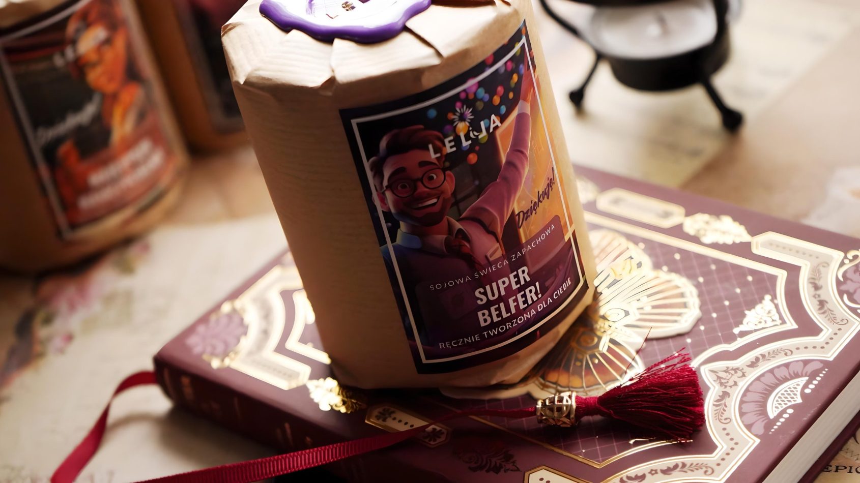 Zamknięta w eleganckim brązowym słoiczku ze złotą nakrętką i ozdobiona lakowaną pieczęcią świeca prezentuje się jak gadżet premium dla prawdziwego mistrza edukacji 🎓. Zabawna etykietka z komiksowym wizerunkiem Super Belfra😎📚 przełamuje szkolną powagę i wywołuje uśmiech już przy pierwszym spojrzeniu – to idealny prezent dla nauczyciela z poczuciem humoru!