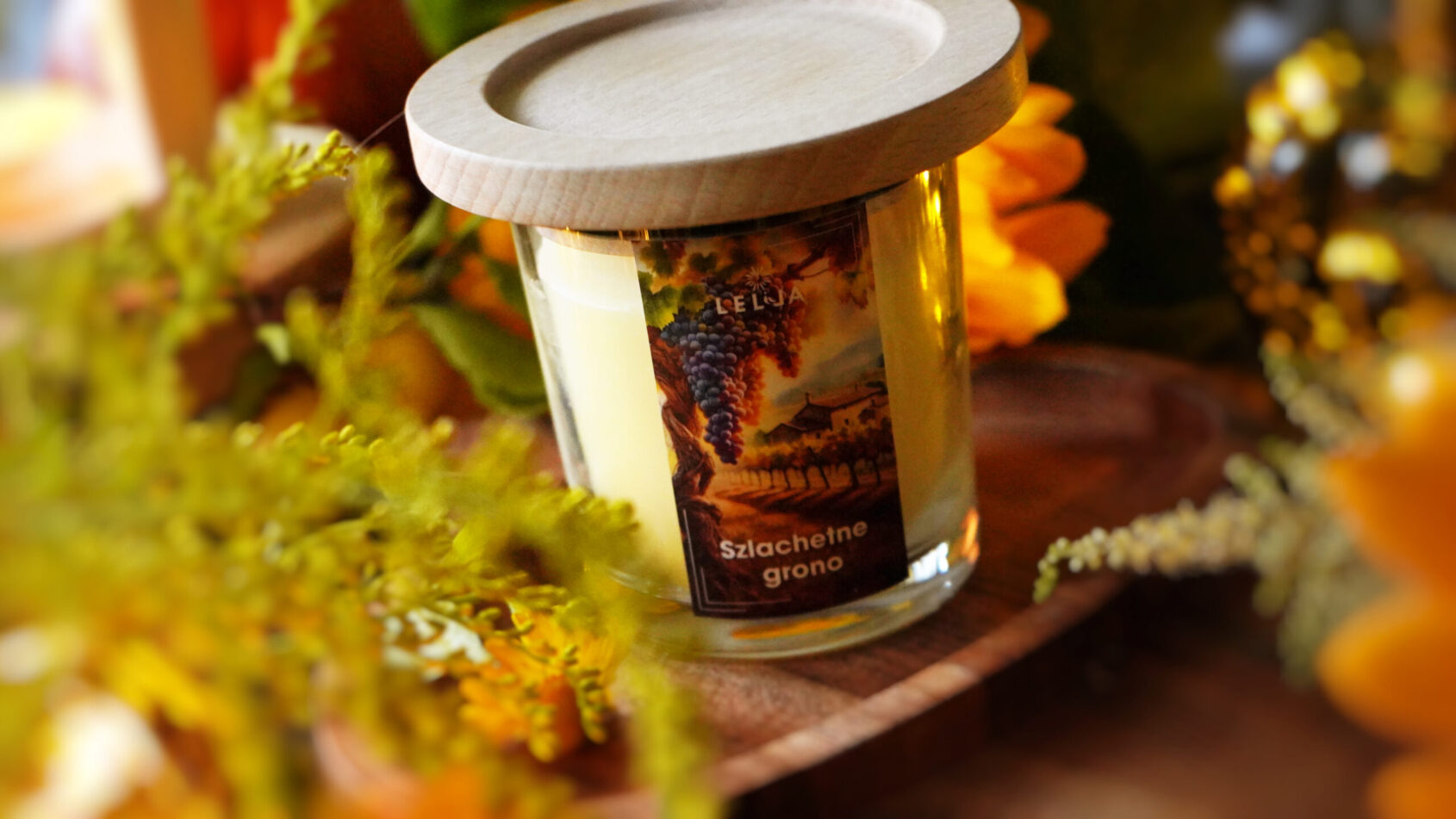 Elegancka świeca sojowa z autorskim designem drewnianej pokrywki z bukowego drewna