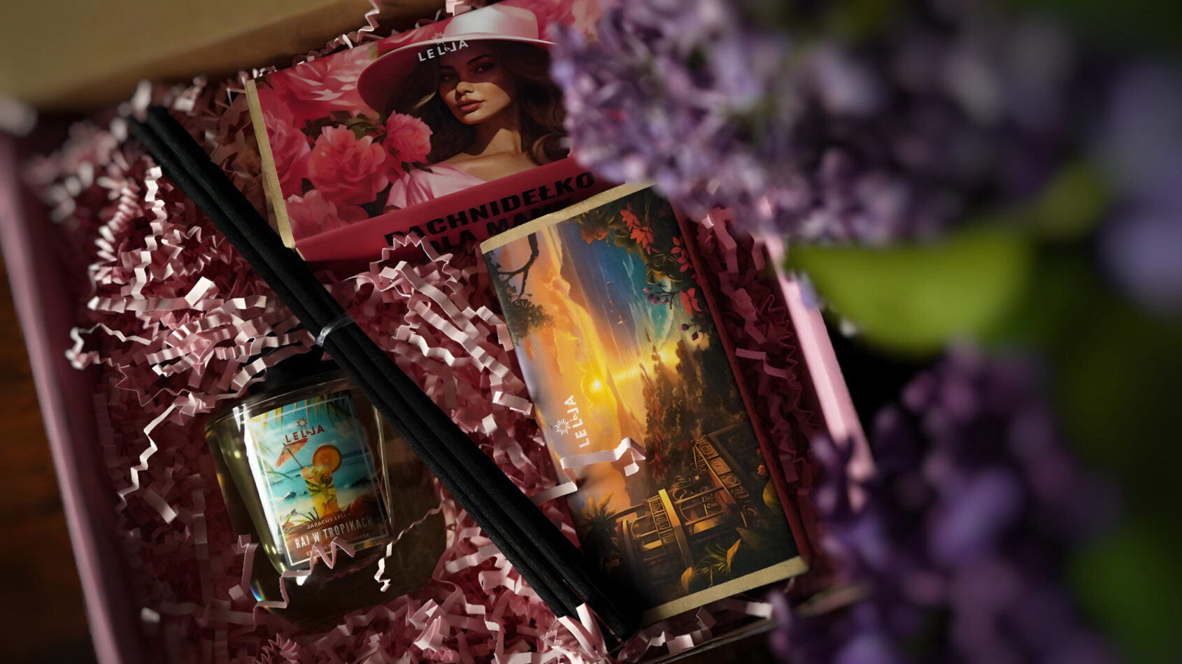 Wszystkie przedmioty umieściłam w różowym pudełku, wypełnionym różowym ekowypełniaczem i przewiązałam satynową wstążką. Wybierz wariant grafiki na pudełku, który najlepiej wyrazi Twoje uczucia: romantyczne „Dziękuję Ci Mamo” ozdobione delikatnymi kwiatami bzu, wzruszające „Kocham Cię Mamo” z motywem subtelnych piwonii lub „Super Mama” z motywem delikatnych konwalii. Potrzebujesz dodatkowej personalizacji? Dołączę bilecik z Twoją specjalną dedykacją – napisz mi o tym podczas składania zamówienia. Bo czasem jedno zdanie, wypowiedziane prosto z serca, potrafi wzruszyć bardziej niż wielostronicowy poemat.